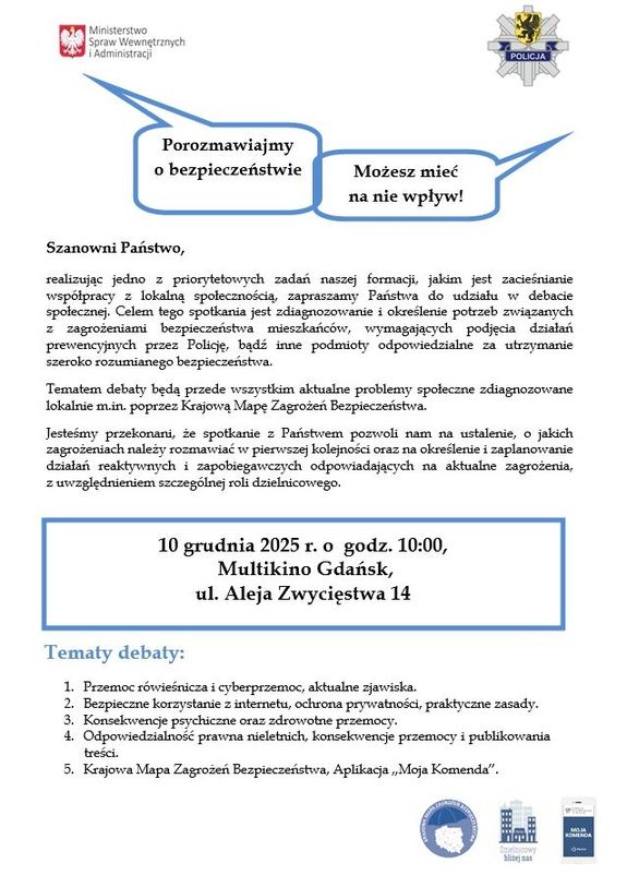 Policjanci z komendy miejskiej wspólnie zapraszają gdańską młodzież na spotkanie dot. bezpieczeństwa. Wspólne rozmowy o bezpieczeństwie w miejscu publicznym i miejscu zamieszkania odbędą się 10 grudnia 2025 roku o 10:00 w sali kinowej Multikina przy Alei Zwycięstwa 14. Serdecznie zapraszamy!