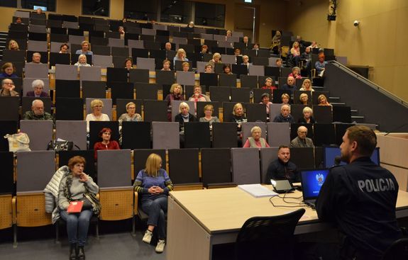 Policjanci spotkali się z seniorami. Podczas debaty funkcjonariusze przekazali, jak skutecznie ustrzec się przed oszustami oraz jak poprawić swoje bezpieczeństwo. Spotkanie odbyło się w sali teatralnej Wydziału Filologii Uniwersytetu Gdańskiego przy ul.Wita Stwosza 57.