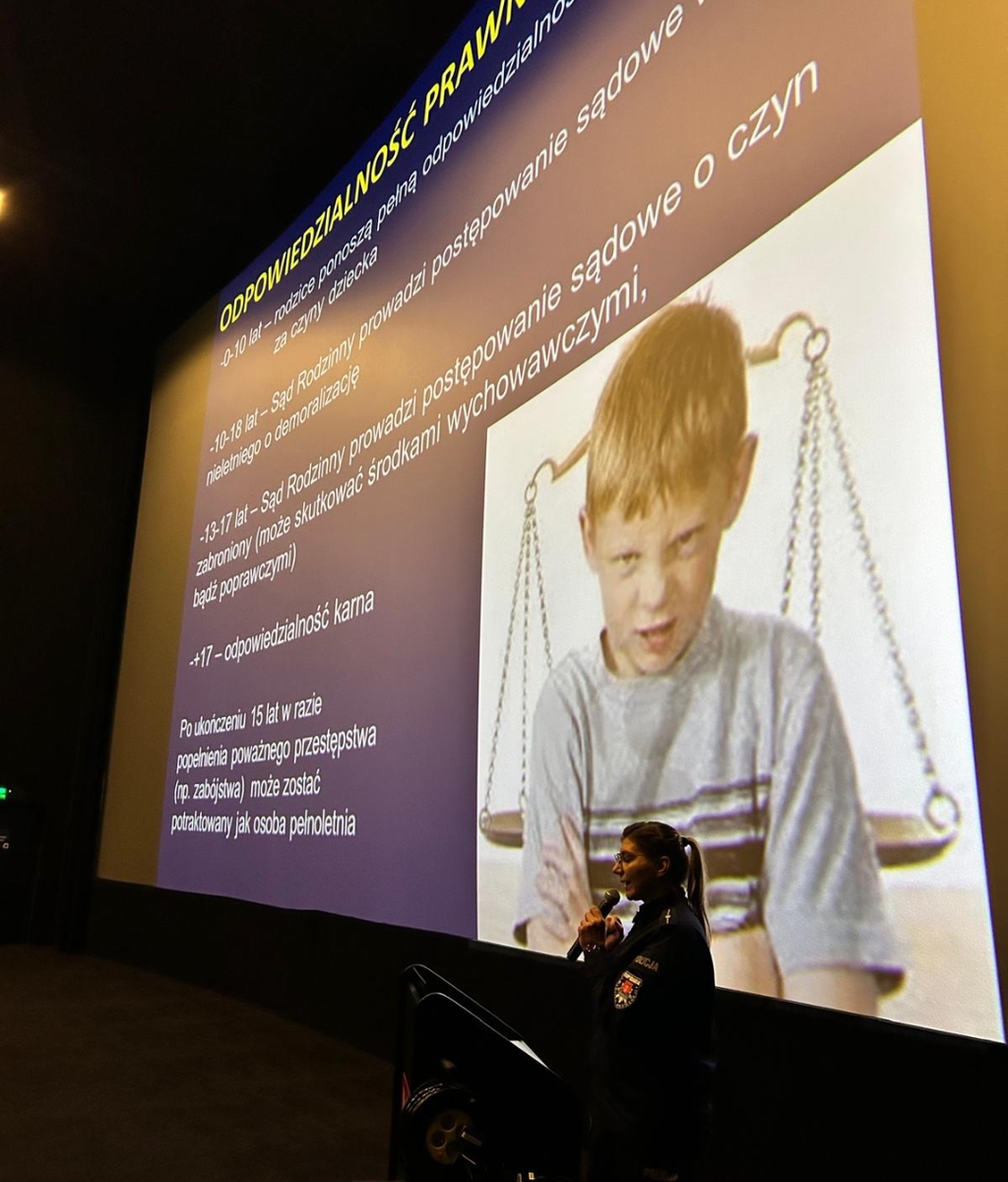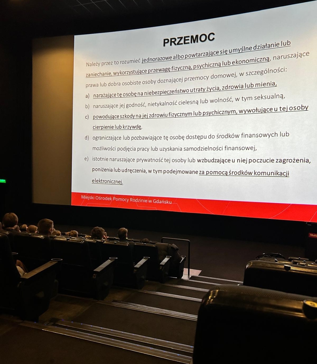 Wczoraj, w sali kinowej Multikina przy al. Zwycięstwa 14 w Gdańsku, w ramach programu „Relacje wolne od przemocy”, policjanci z Wydziału Prewencji Komendy Miejskiej Policji w Gdańsku oraz specjalistka ds. przeciwdziałania przemocy domowej z Ośrodka Interwencji Kryzysowej MOPR w Gdańsku, omawiali zagadnienia związane z bezpieczeństwem wśród nieletnich, w szczególności problematykę przemocy rówieśniczej, odpowiedzialności prawnej nieletnich, cyberzagrożeń oraz dostępnych form pomocy i wsparcia. W spotkaniu udział wzięło łącznie około 230 uczniów z czterech gdańskich szkół.