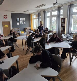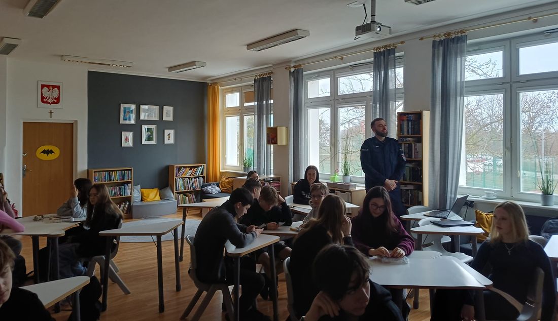 Podczas spotkania z uczniami VIII klasy funkcjonariusze omówili zagrożenia związane z korzystaniem z internetu. Policjanci poruszyli m.in. temat cyberprzemocy, hejtu, fałszywych profili, kradzieży danych oraz oszustw internetowych. Uczniowie dowiedzieli się także, jak rozpoznać próby manipulacji w sieci oraz dlaczego nie należy udostępniać swoich danych osobowych osobom trzecim.