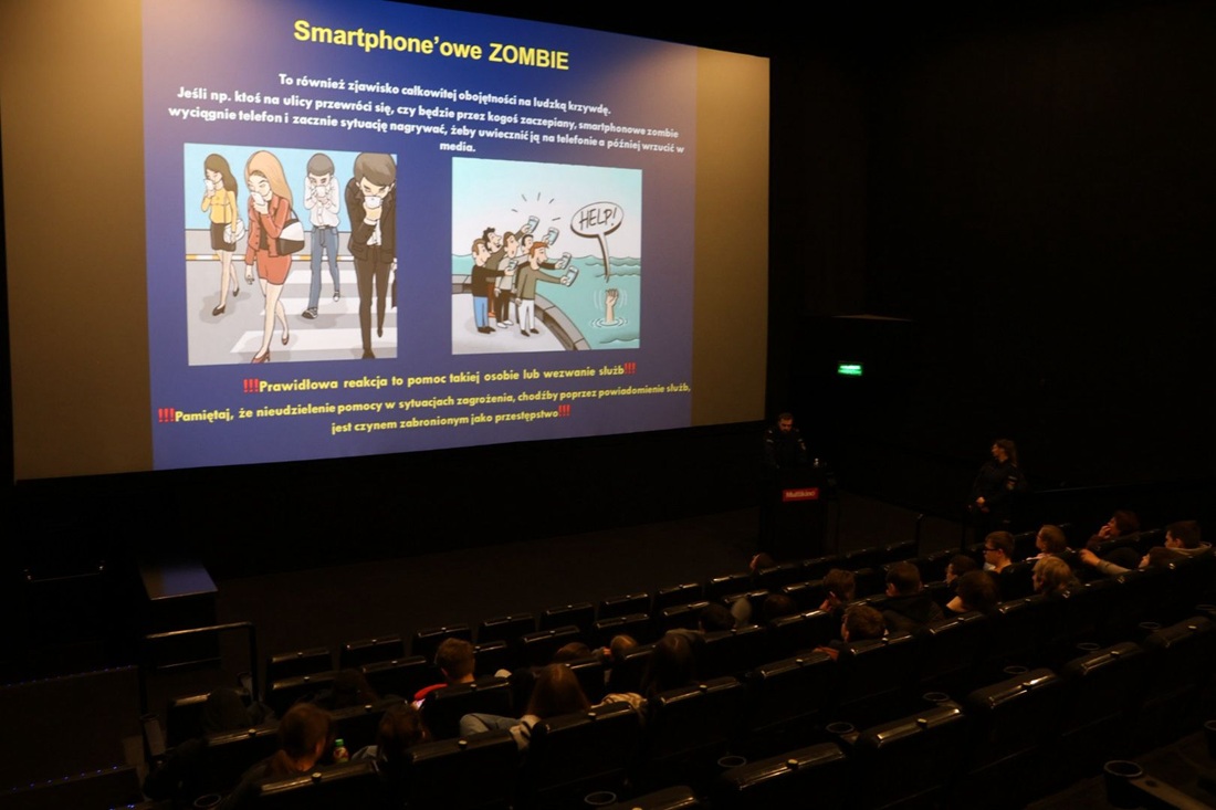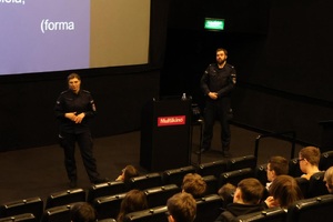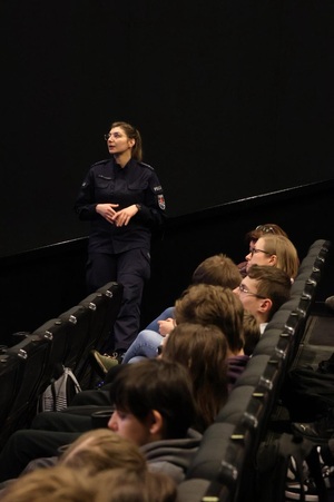 W minioną środę (18.03.2026r.), w sali kinowej Multikina przy al. Zwycięstwa w Gdańsku, w ramach projektu „Relacje wolne od przemocy”, policjanci z Wydziału Prewencji Komendy Miejskiej Policji w Gdańsku oraz specjalistka ds. przeciwdziałania przemocy domowej z Ośrodka Interwencji Kryzysowej MOPR w Gdańsku, omawiali zagadnienia związane z bezpieczeństwem, a w szczególności problematykę przemocy w szkołach oraz temat odpowiedzialności prawnej nieletnich. Po prelekcji młodzieży zaprezentowany został film edukacyjny.