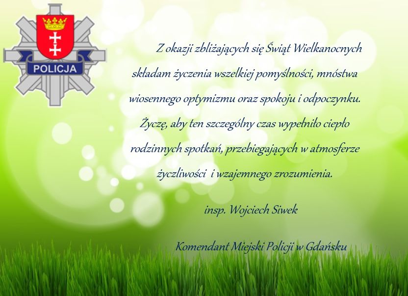 Życzenia Wielkanocne od Komendanta Miejskiego Policji w Gdańsku Data publikacji 18.04.2019 Powrót Drukuj